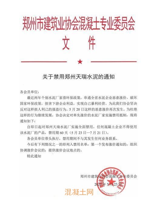 2022年5月24日,鄭州市建筑業(yè)協(xié)會混凝土專業(yè)委員會網(wǎng)站發(fā)布《關于禁用鄭州天瑞水泥的通知》。據(jù)該通知顯示,鄭州市建筑業(yè)協(xié)會混凝土專業(yè)委員會以通知的形式要求各會員單位禁用鄭州天瑞水泥60天,目的是對率先漲價的水泥廠家實施禁用抵制。