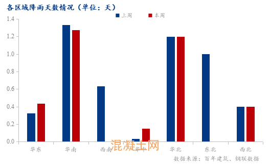 本周國內145個城市降雨天數減少0.1天,平均當周影響混凝土發運量的降雨天數為0.5天,西南多地遭遇極端高溫天氣,華北、華南雨水不斷,季節性因素影響仍然突出。