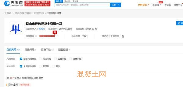 記者從天眼查了解到,昆山市佳瑋混凝土有限公司風險等級平級為高,存在自身風險197條、周邊風險8條、歷史風險52條以及預警提醒3條。