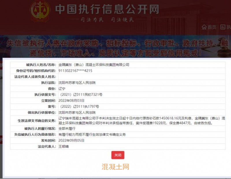 案號為(2022)遼0111執1797號顯示,執行依據文號為(2021)遼0111民初7321號,做出執行依據單位、執行法院均為沈陽市蘇家屯區人民法院。生效法律文書確定的義務為遼寧瑞豐混凝土有限公司于本判決生效之日起十日內給付原告砂石款1450618.16元及利息,金隅冀東(唐山)混凝土環保科技集團有限公司對本判決承擔連帶責任,案件受理費19228元,保全費4847元,由被告負擔。失信被執行人行為具體情形為有履行能力而拒不履行生效法律文書確定義務。