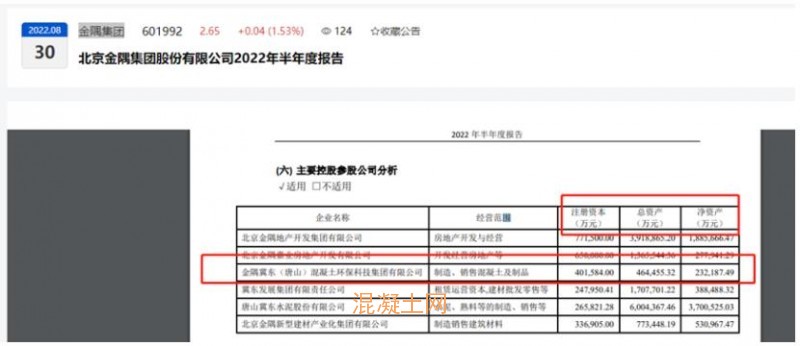 金隅集團2022年半年報顯示,截至2022年6月30日,金隅冀東混凝土注冊資本40.15億元,總資產46.45億元,凈資產23.22億元。