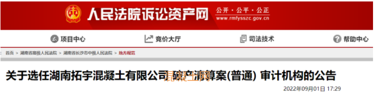 2022年9月1日,湖南拓宇混凝土有限公司破產清算申請被人民法院訴訟資產網裁定受理。據了解,湖南拓宇混凝土有限公司成立于2010年04月20日,注冊地位于長沙市望城區烏山創業富民工業園,法定代表人為代建華。經營范圍包括透水混凝土生產;混凝土制造;五金、家具及室內裝飾材料零售;五金產品批發;工程施工總承包;混凝土、再生建筑材料的銷售。