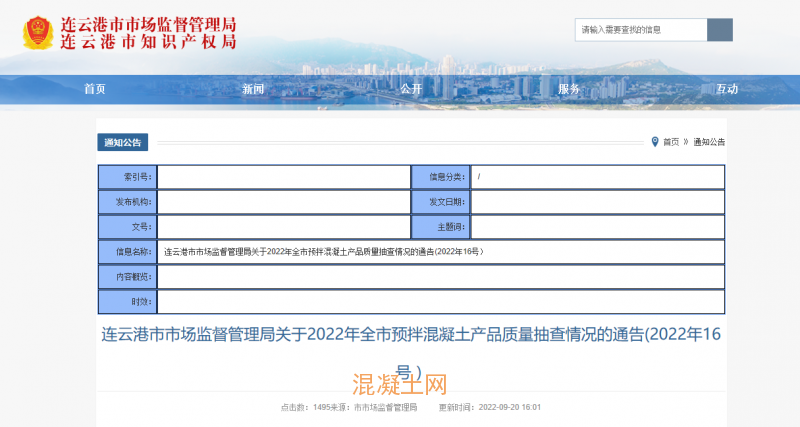日前,江蘇省連云港市市場監督管理局關于2022年全市預拌混凝土產品質量抽查情況的通告(2022年16號)公布。