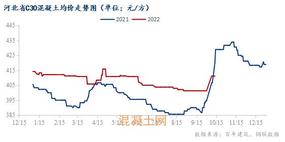 截至10月13日,河北省混凝土均價411.11元/方,同比下跌8.89元/方,環比上漲9.86元/方。近期河北多地水泥價格有所推漲,加之砂石相對緊缺,企業生產成本上漲,混凝土價格小幅上行。