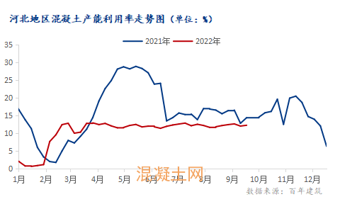 截至10月13日,調研河北17家混凝土企業,混凝土產能利用率為11.98%,環比下降0.62個百分點。周產量環比減少4.93%。本輪調研期間,河北省多地雨水持續,加之部分地區受疫情影響,工地施工進度放緩,因此發運量有所減少。