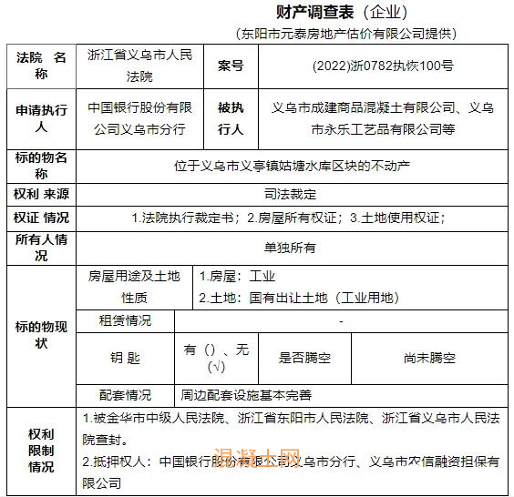 位于義烏市義亭鎮姑塘水庫區塊的工業房地產,土地使用權總面積26049.0平方米,使用權類型為出讓,土地終止日期為2052年06月25日(義烏國用(2004)字第3-2102號)、2052年09月25日(義烏國用(2002)字第3-4315號),宗地內證載建筑面積為10512.10平方米;宗地內有未確權建筑面積合計7505.10平方米;另有水泥地、圍墻、電動移門、水塔、配電設施等附屬設施。房屋登記時間:2013年9月6日。