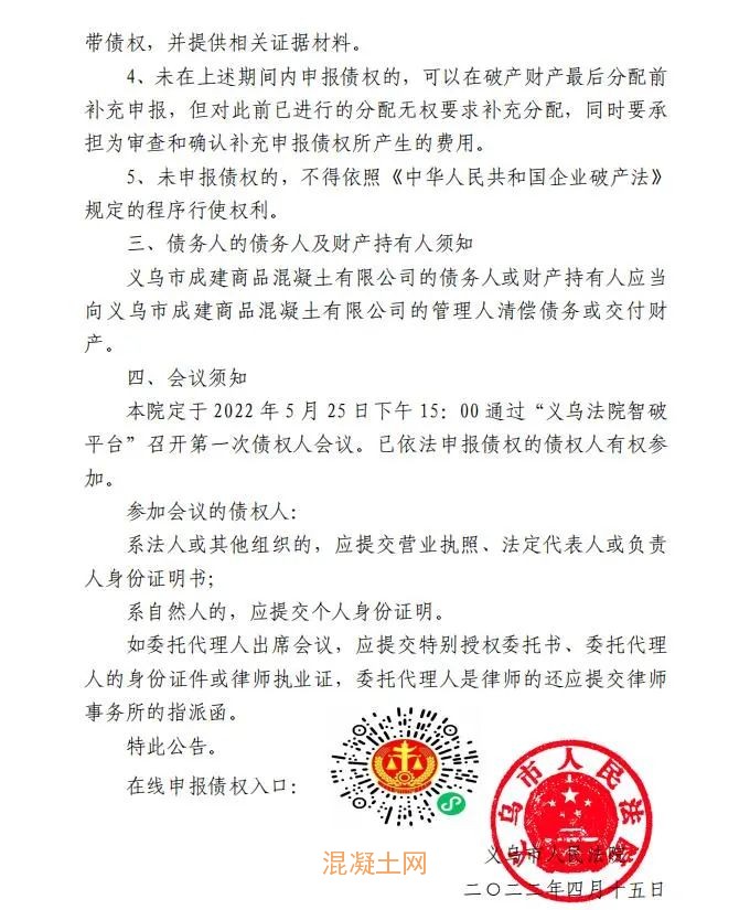 而在2022年4月15日,浙江省義烏市人民法院就發出公告,根據申請人陳林正的申請,于2022年4月11日裁定受理義烏市成建商品混凝土有限公司破產清算一案。