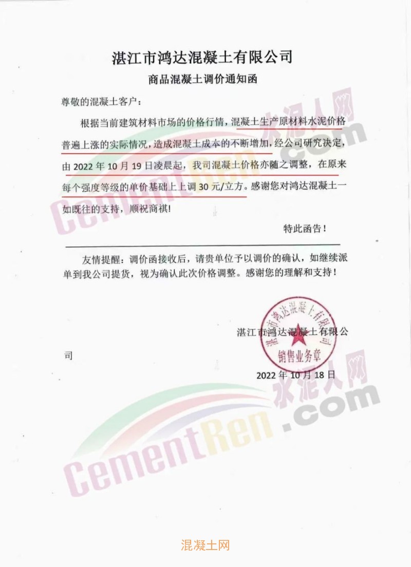 日前,廣東省內廣東廉江市智鑫建材有限公司、廉江市鵬港混凝土有限公司、湛江市鴻達混凝土有限公司、湛江新航混凝土有限公司、廉江市中和建材有限公司、遂溪縣榮德混凝土有限公司、廣州勇創混凝土有限公司、廣東基礎新世紀混凝土有限公司、廣州興業混凝土攪拌有限公司、廣州超力混凝土有限公司、廣州市華合建筑材料有限公司、廣東永泰混凝土有限公司等十多家企業通知混凝土價格基礎上上調10-30元/立方。