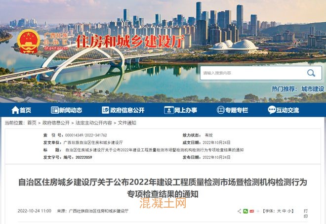 近日,廣西壯族自治區住房城鄉建設廳公布2022年建設工程質量檢測市場暨檢測機構檢測行為專項檢查結果。今年7月至8月,廣西壯族自治區住建廳對全區121家檢測機構開展檢查。結果顯示,有20家檢測機構存在偽造檢測數據、出具虛假檢測報告的行為。
