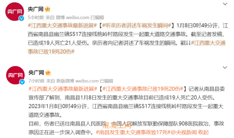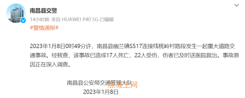 當(dāng)?shù)鼐用裉峁┑墓俜酵▓蠓Q,2023年1月8日0時50分,在南昌縣幽蘭鎮(zhèn)桃?guī)X村紅溪章家自然村發(fā)生一起重大交通事故,一輛重型半掛牽引車(屬于樂平某物流公司),撞上出殯隊伍,初步掌握,事故已造成17人死亡、22人受傷,傷者已送往醫(yī)院搶救,車輛核載質(zhì)量32700KG,車輛裝載砂石。