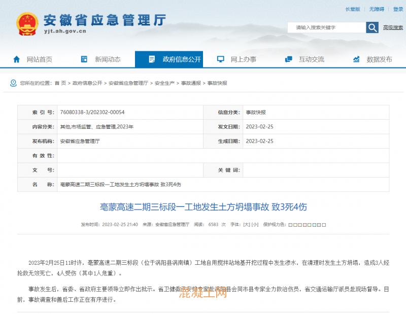 2月25日11時許,亳蒙高速二期三標段(位于渦陽縣渦南鎮)工地自用攪拌站地基開挖過程中發生滲水,在清理時發生土方坍塌,造成3人經搶救無效死亡,4人受傷(其中1人危重)。