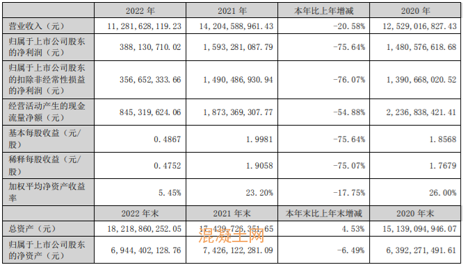 4月14日,萬年青(SZ000789,股價9.03元,市值72億元)披露了2022年年報,公司2022年實現(xiàn)營業(yè)總收入112.82億元,同比下降20.6%;實現(xiàn)歸母凈利潤3.88億元,同比下降75.6%;基本每股收益為0.49元。