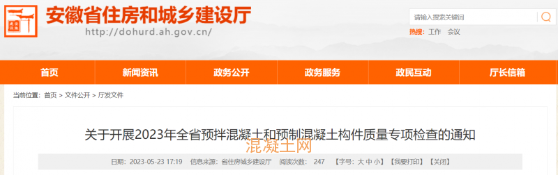 為強化工程質量管理,保障建筑工程質量安全,根據《安徽省促進散裝水泥發展和應用條例》《安徽省人民政府關于促進裝配式建筑產業發展的意見》(皖政〔2020〕21號)和省住房城鄉建設廳、省市場監督管理局《關于加強預拌混凝土質量管理的通知》(建質函〔2021〕35號)等要求,經研究,決定開展2023年全省預拌混凝土和預制混凝土構件質量專項檢查,現將有關事項通知如下。