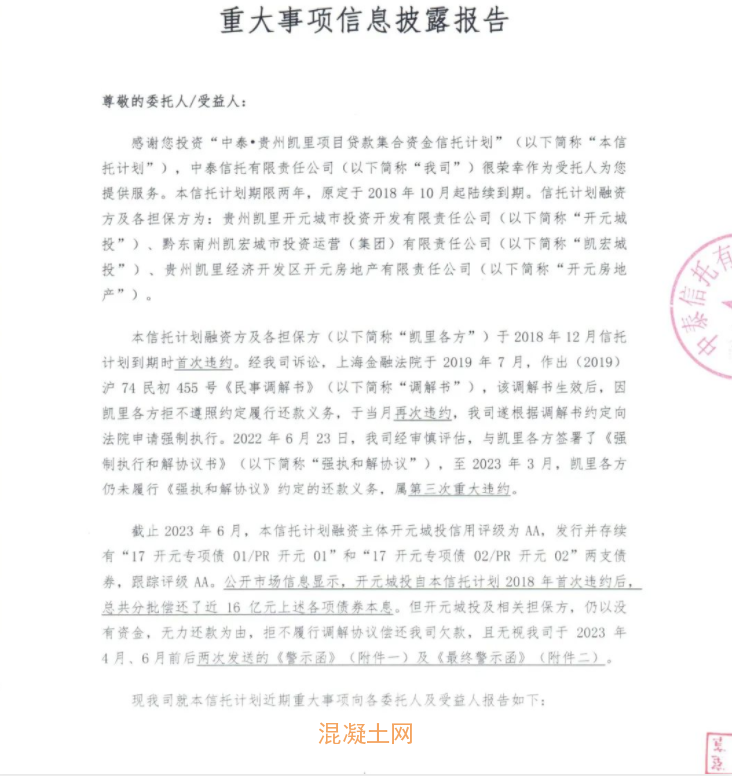 根據(jù)“報告”顯示,信托計劃期限兩年,原定于2018年10月起陸續(xù)到期。融資方為貴州凱里開元城市投資開發(fā)有限責(zé)任公司(“開元城投”)、擔(dān)保方之一為黔東南州凱宏城市投資運營(集團(tuán))有限責(zé)任公司(“凱宏城投”)。2018年12月該信托計劃到期時發(fā)生首次違約,經(jīng)信托公司訴訟,上海金融法院于2019年7月作出《民事調(diào)解書》,但融資方及擔(dān)保方拒不遵照約定履行還款義務(wù),于當(dāng)月再次違約,之后信托公司向法院申請強制執(zhí)行,至2023年3月,融資方及擔(dān)保方仍未履行《強執(zhí)和解協(xié)議》約定的還款義務(wù),屬第三次重大違約。