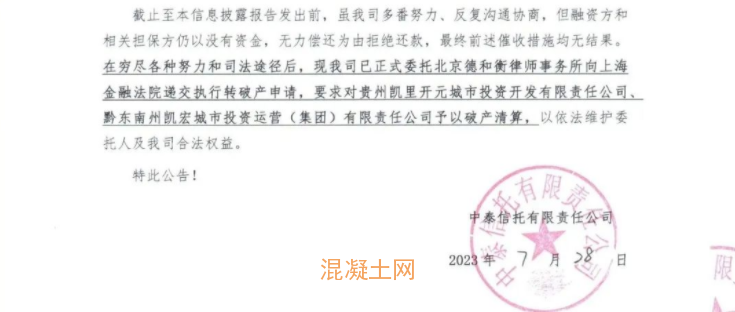 7月28日,中泰信托發(fā)布“貴州凱里項目貸款集合資金信托計劃重大事項信息披露報告”。城投平臺三次違約仍不還款,已正式向上海金融法院遞交執(zhí)行轉(zhuǎn)破產(chǎn)申請,要求對貴州凱里開元城市投資、黔東南州凱宏城投予以破產(chǎn)清算。