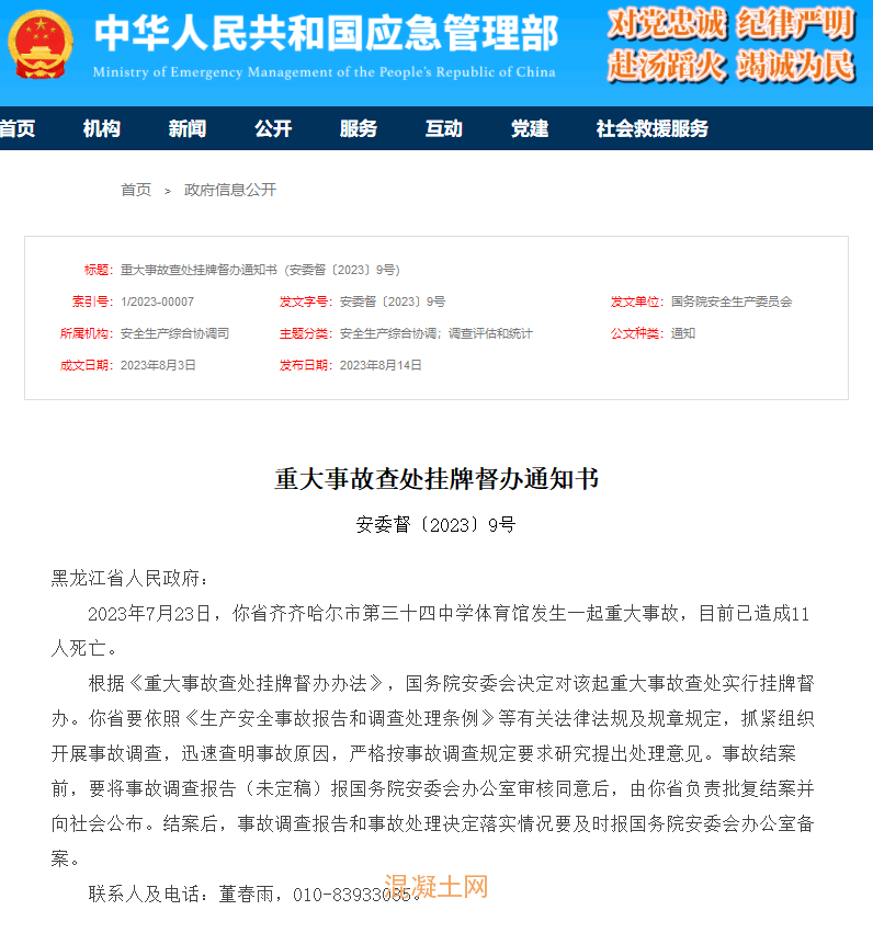 8月14日,應急管理部網站發布一則“重大事故查處掛牌督辦通知書”,國務院安全生產委員會決定對齊齊哈爾市第三十四中學體育館發生的一起重大事故查處實行掛牌督辦,全文如下: