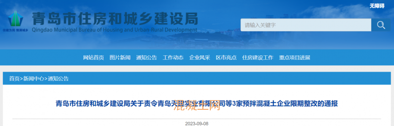 近日,青島市住房和城鄉建設局發布關于責令青島天建實業有限公司等3家預拌混凝土企業限期整改的通報,全文如下: