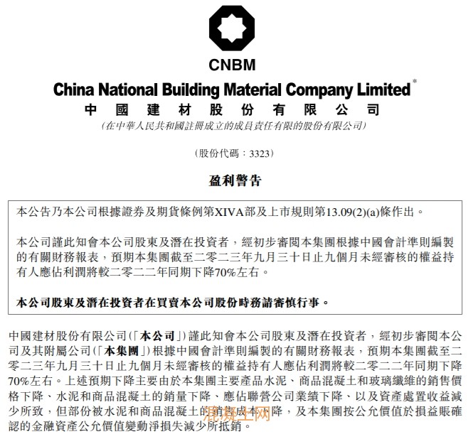 10月16日,中國(guó)建材股份有限公司發(fā)布盈利警告,經(jīng)初步審閱公司及其附屬公司根據(jù)中國(guó)會(huì)計(jì)準(zhǔn)則編制的有關(guān)財(cái)務(wù)報(bào)表,預(yù)期集團(tuán)截至2023年9月30日止9個(gè)月未經(jīng)審核的權(quán)益持有人應(yīng)占利潤(rùn)將較2022年同期下降70%左右。