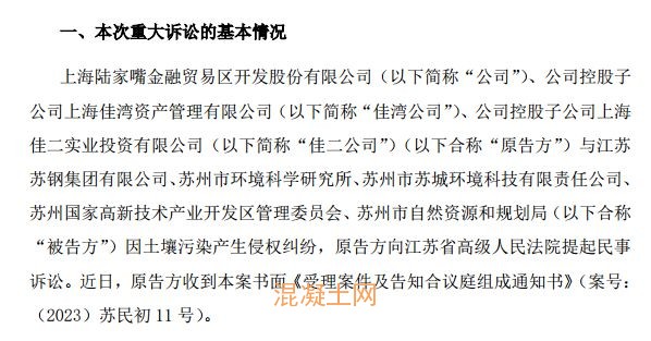 查詢公告發現,陸家嘴(以下簡稱公司)在11月3日發布的公告中透露,下屬子公司因土壤污染問題,將江蘇蘇鋼集團有限公司(以下簡稱“蘇鋼集團”)、蘇州市環境科學研究所、蘇州市蘇城環境科技有限責任公司、蘇州國家高新技術產業開發區管理委員會、蘇州市自然資源和規劃局告上法庭,近日收到了江蘇省高級人民法院的書面案件受理通知書。