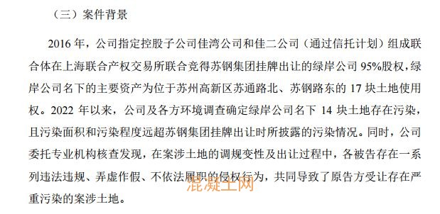 公告中提及,案件的背景是2016 年,公司指定控股子公司佳灣公司和佳二公司(通過信托計劃)組成聯 合體在上海聯合產權交易所聯合競得蘇鋼集團掛牌出讓的綠岸公司 95%股權,綠 岸公司名下的主要資產為位于蘇州高新區蘇通路北、蘇鋼路東的 17塊土地使用 權。2022 年以來,公司及各方環境調查確定綠岸公司名下14塊土地存在污染, 且污染面積和污染程度遠超蘇鋼集團掛牌出讓時所披露的污染情況。同時,公司 委托專業機構核查發現,在案涉土地的調規變性及出讓過程中,各被告存在一系 列違法違規、弄虛作假、不依法履職的侵權行為,共同導致了原告方受讓存在嚴 重污染的案涉土地。
