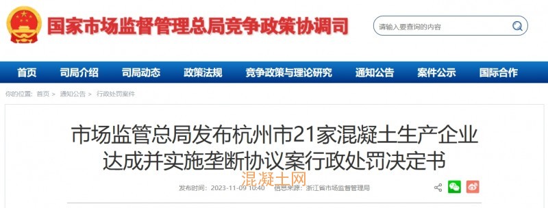 11月9日,市場監管總局發布《杭州市21家混凝土生產企業達成并實施壟斷協議案行政處罰決定書》。浙江省市場監管局于2021年11月對杭州市21家混凝土生產企業達成并實施壟斷協議立案調查。2023年7月27日,江蘇省市場監管局對當事人作出行政處罰決定。