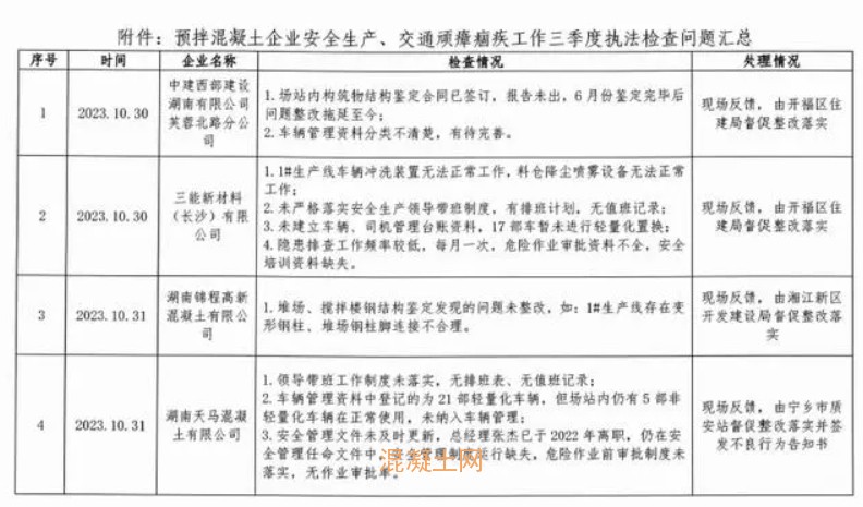 同時(shí),該局還查處了部分企業(yè)交通頑瘴痼疾整治措施及“九個(gè)必須”落實(shí)不到位的情況。如湖南天馬混凝土有限公司場(chǎng)內(nèi)有5部非輕量化車正在使用,且未見(jiàn)管理資料;瀏陽(yáng)市柏建混凝土有限公司運(yùn)輸合同簽訂不規(guī)范,合同乙方均為個(gè)人(個(gè)體承運(yùn)戶)等。湖南天馬混凝土有限公司因問(wèn)題較為嚴(yán)重,由寧鄉(xiāng)市質(zhì)安站簽發(fā)不良行為告知書(shū)。