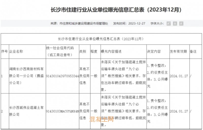具體來看,第一批曝光2家企業,分別為湖南長沙西南新材料有限公司一分公司(騰盛分公司)、長沙西城偉業混凝土有限公司,兩家公司未落實《關于加強混凝土攪拌運輸車源頭治超“九個必須”斷然措施》相關要求,存在出場車輛過磅率低、超載現象。