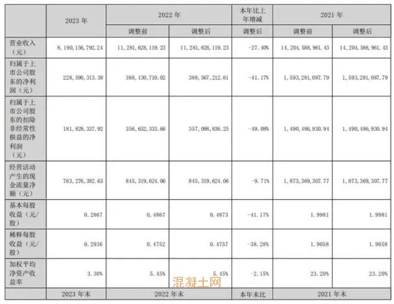 報告顯示,2023年萬年青實現營業收入81.9億元,同比下降27.4%;實現歸屬于上市公司股東的凈利潤2.29 億元,同比下降41.17%;歸屬于上市公司股東的扣除非經常性損益的凈利潤1.82億元,同比下降49.08%。