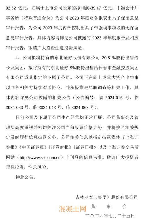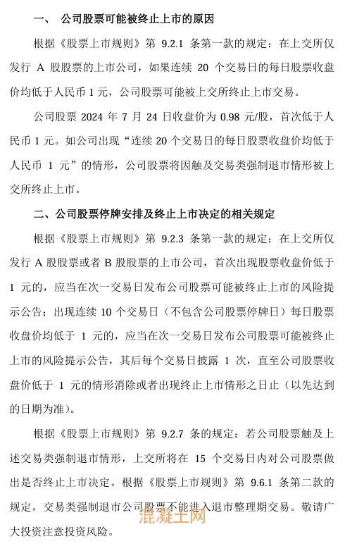 亞泰集團公告,公司股票于2024年7月24日收盤價為0.98元/股,首次低于1元。根據上交所規定,如連續20個交易日收盤價均低于1元,公司股票可能被終止上市。公司提示,若觸及強制退市情形,上交所將在15個交易日內做出是否終止上市決定,且公司股票不能進入退市整理期交易。