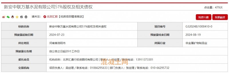 據北京產權交易所平臺顯示,7月23日,新安中聯萬基水泥有限公司51%股權及相關債權預掛牌進行轉讓。