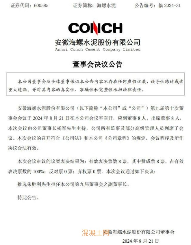 8月21日,海螺水泥發布公告,公司第九屆第十次董事會會議于2024年8月21日召開,推選朱勝利先生擔任本公司第九屆董事會之副董事長。