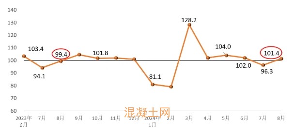 2024年8月份,建筑材料工業景氣指數為101.4點,環比7月份回升5.1點,比上年同月高2.0點,高于臨界點,回升至景氣區間,行業經濟運行低位小幅回復。