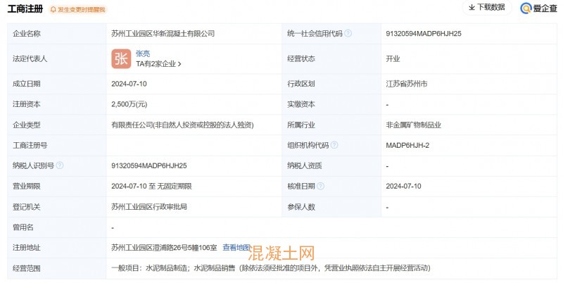 近日,蘇州工業園區華新混凝土有限公司成立,法定代表人為張亮,注冊資本為2500萬元,經營范圍包含:水泥制品制造;水泥制品銷售等。股權數據顯示,該公司由華新水泥間接全資持股。