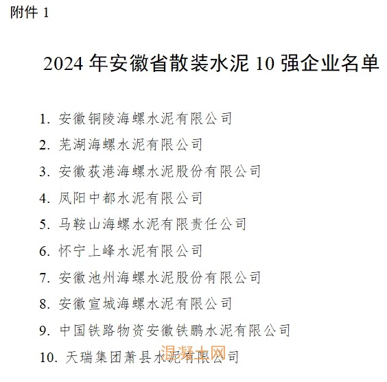 附件:1. 2024年安徽省散裝水泥10強(qiáng)企業(yè)名單