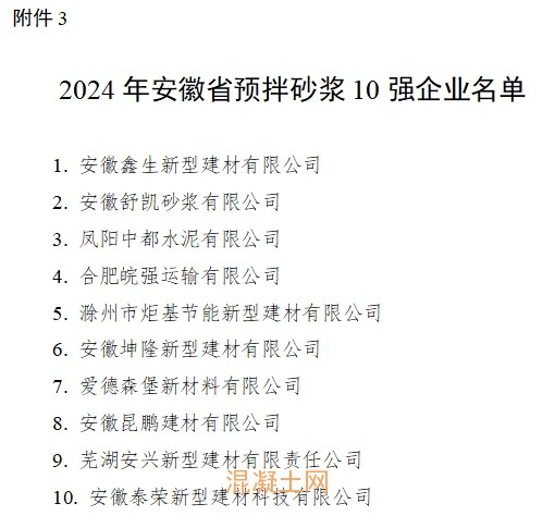 3.2024年安徽省預(yù)拌砂漿10強(qiáng)企業(yè)名單