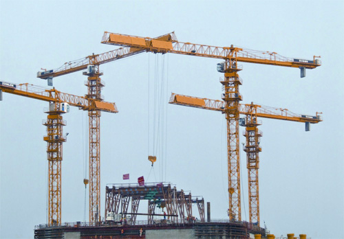 平頭塔機(jī),明顯的特點就是沒有塔頂,起重臂(力學(xué)模型為懸臂梁)與塔身剛性連接。由于取消了塔頂和起重臂拉桿,塔機(jī)安裝、拆卸更加方便快捷。同時起重臂可在空中裝拆,所以適合一些特殊工程施工的需要,如電力行業(yè)冷卻塔、斜拉索大橋的施工,以及工地狹窄、地面不平等場所。由于沒有塔頂,在塔機(jī)密集的工地工作時,抗干擾性要好于同級別的塔頭式塔機(jī),因而特別適用于塔機(jī)高密度工地、高效率工地、工地環(huán)境較差的場所。平頭塔機(jī)的起重臂從根部到端部由粗變細(xì),視覺效果很好,遠(yuǎn)遠(yuǎn)看去象一把豎立在地上的錘子,所以又俗稱為錘頭式塔機(jī)。但起重臂重量較大、整機(jī)較重、成本較高是它的弱點。