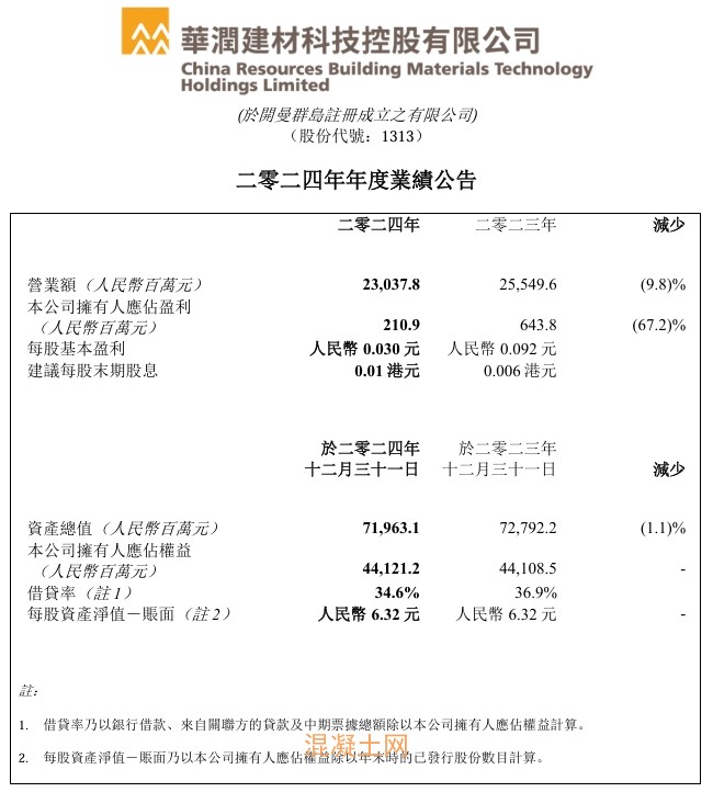 日前,華潤建材科技發布2024年年度業績公告顯示,公司2024年營業額約230.38億元,同比減少9.8%;公司擁有人應占盈利2.11億元,同比減少67.2%。