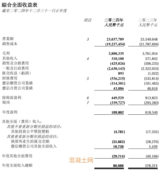 于2024年,該公司水泥產品、混凝土及骨料的平均售價分別為每噸人民幣 243.7 元、每立方米人民幣319.5元及每噸人民幣36.4 元,較2023年分別減少 10.6%、減少 12.9%及增加 2.8%。集團的水泥產品售價下調,主要是由于中國經濟增長及興建活動放緩所致。