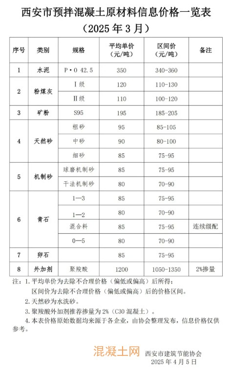 西安市預拌混凝土原材料信息價格一覽表(2025年3月)