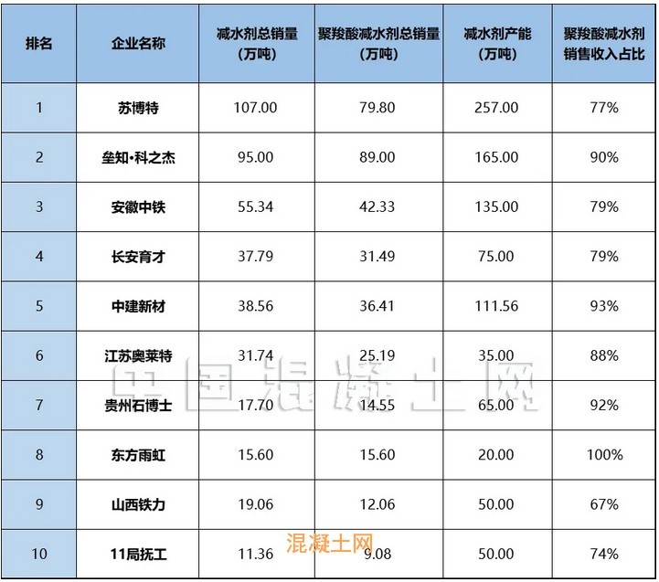 注:以2023年各企業實際銷售額為依據,經過對各項數據的權重比較得出最終排名。(聚羧酸減水劑銷量以20%濃度計算)