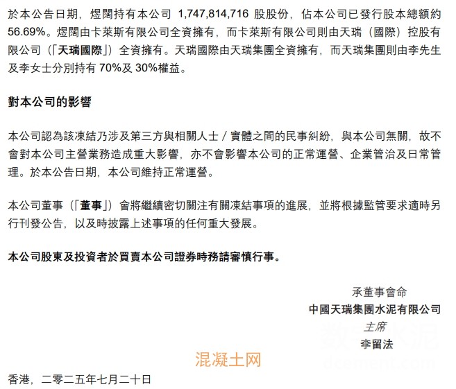 中國天瑞水泥7月20日在港交所公告,收到控股股東煜闊有限公司通知,李留法夫婦所持天瑞集團100%股份被深圳前海合作區人民法院司法凍結。凍結期為3年,自2025年7月10日至2028年7月9日,期間天瑞集團的股份不得轉讓或質押,且天瑞集團不得向李留法夫婦派發任何股息或紅利。