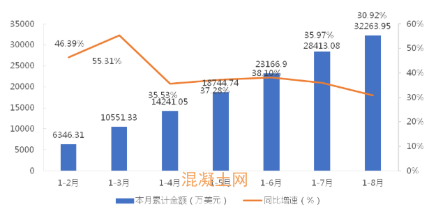 2025年1-8月我國混凝土泵車累計出口金額及同比增速