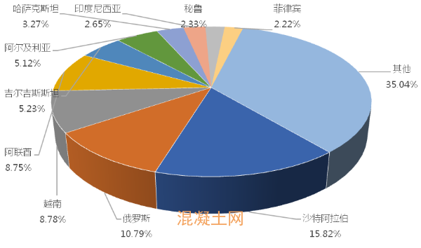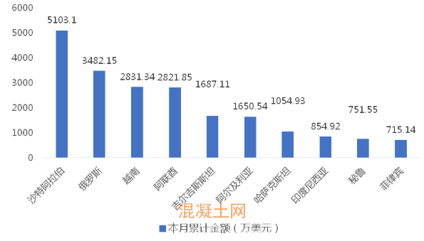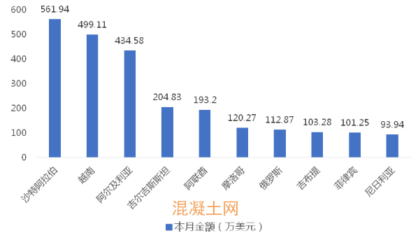 1-8月,我國混凝土泵車出口金額排名前十的國家/地區分別為沙特阿拉伯、俄羅斯、越南、阿聯酋、吉爾吉斯斯坦、阿爾及利亞、哈薩克斯坦、印度尼西亞、秘魯、菲律賓,合計占我國該產品出口總額的64.94%。其中,向沙特阿拉伯出口最多,金額為5103.10萬美元,占出口總額的15.82%。