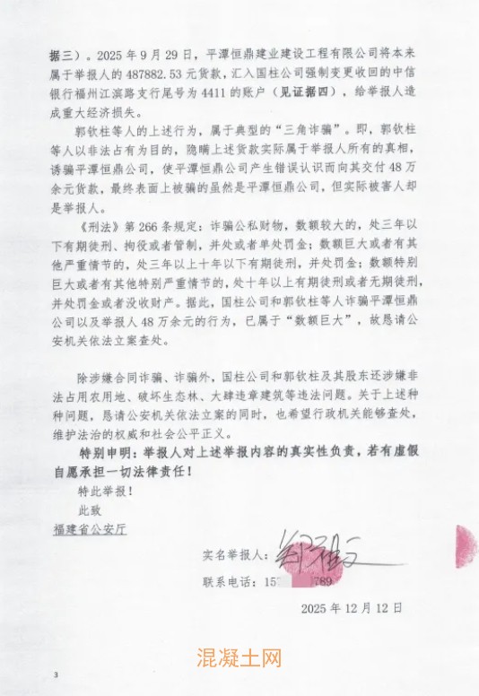 近日,福州市民鄭先生向福建省公安廳李建成廳長舉報(bào)福建國柱混凝土有限公司(下稱“國柱公司”)實(shí)控人郭欽柱及其股東涉嫌合同詐騙、詐騙,懇請(qǐng)公安機(jī)關(guān)依法予以立案查處。