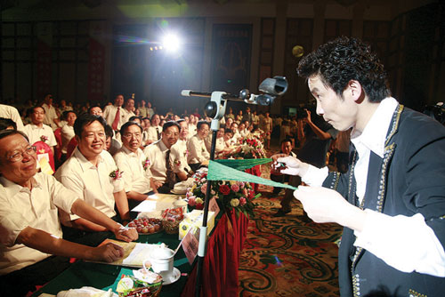 楊雨辰大步返回舞臺,這次他就地取材,拿起一個麥克風支架,往前一立,手中不知何時又多了一方綠色手絹。他用手絹拉住支架桿,輕輕吹一口氣,再一拉,手絹竟穿桿而過,大家報以熱烈掌聲。接著他再次來到臺下觀眾席前,只見他把支架立在觀眾面前,一吹、一拉、手絹穿桿而過,幾百雙銳利的眼睛盯著,愣是沒有找出破綻。