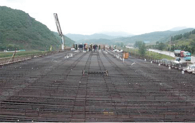 荒溝公公分離式立交橋地處喬家堡和東國林兩個村莊中間,地勢狹窄,人多、車多、交通擁擠,受地面各種干擾施工難度大,設計結構比較復雜。經過丹海項目部建設者一個多月的前期托架、模板安裝、承載力試驗、鋼筋加工、張拉錨具安裝準備,各項工序有條不紊,并于25日晚通過了駐地監理、第二總監辦的各項技術檢查驗收,26日早7時開始澆注。丹海項目再次成為全線率先成功澆注公公分離式立交橋的單位。作為全線首座現澆公公分離式立交橋,業主、監理都非常重視,駐地辦監理在澆注前對鋼筋綁扎、模板安裝、臺架支承、安全防護等每個分項都進行了跟蹤檢查。檢查驗收通過后,第二總監辦趙一凡總監評價道:“中鐵十三局的荒溝分離式立交橋與其它標段兩座分離式立交橋相比,盡管上場晚,可后來者居上,進度快、質量也好,特別是鋼筋綁扎橫平豎直,為其它現澆橋施工樹立了榜樣”。荒溝公公分離式立交橋率先順利地澆注,大大鼓舞了丹海項目部所有參戰人員的士氣,為該大橋的右幅下步施工提供了技術支持和精神動力。也為中鐵十三局在丹海線上贏的了聲譽。