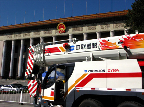 白天,天安門廣場正緊鑼密鼓的為國慶做現場布置。廣場兩側代表56個名族的巨大立柱非常顯眼。而我們的吊臂也高高聳立在廣場一側,在場內眾多專用設備中,它是唯一能在閱兵式那一天保持這種工作姿態出現在天安門廣場的設備。
