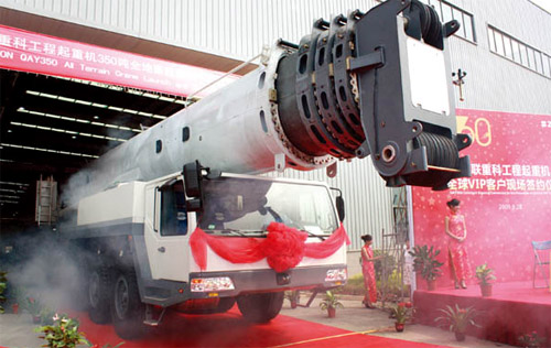 9月28日,共和國60華誕前夕,中聯重科17周年司慶。中聯重科工程起重機公司在湖南長沙隆重推出兩款大噸位起重機新品——350噸全地面起重機和1000噸履帶式起重機。9月28日上午,中聯泉塘工業園舉行了隆重的350噸全地面汽車起重機下線及簽約儀式。下午,350噸全地面汽車起重機及1000噸履帶式起重機新品推介會在華雅大酒店舉行。來自全世界各地的近百位外賓齊聚一堂,共同見證了這一時刻。