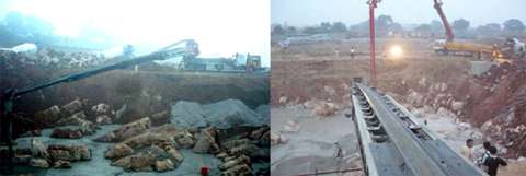 很快工地施工人員就喜歡上了這臺設備,他們說在泵車布料1 車混凝土的時間里,皮帶輸送機可以布料3-4 車料,這極大地提高了工作效率,保證了工程進度,其工作表現(xiàn)和經(jīng)濟性都非常突出。 由于混凝土在皮帶機的尾膠管內(nèi)沒有任何壓力,完全是靠本身重力的作用往下落的,所以決不會產(chǎn)生由于壓力突變而產(chǎn)生的尾膠管異常甩管,這不但對尾膠管操作手來說更安全,而且在不需要精確定位的情況下還可以不配置尾膠管操作手,由皮帶機操作手通過無線遙控器直接控制臂架的動作進行布料,所以在一定程度上也降低了勞動強度和布料成本。