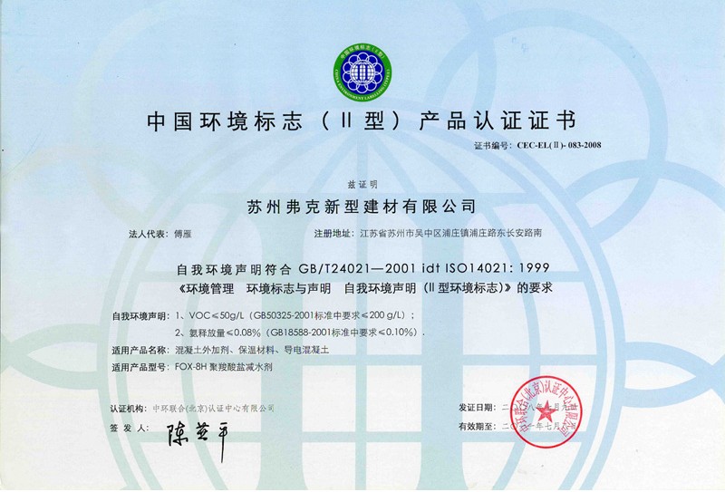 2007年企業被評為[江蘇省高新技術企業] 、FOX牌高性能聚羧酸減水劑被評為[江蘇省高新技術產品]、全國外加劑行業聚羧酸減水劑生產綜合銷量前三名的榮譽稱號,同時企業在2006年完成了質量和環境管理體系ISO19001-2000 ISO14001-2004的認證及07年度監督審核。2008年被評為江蘇省名牌產品稱號。